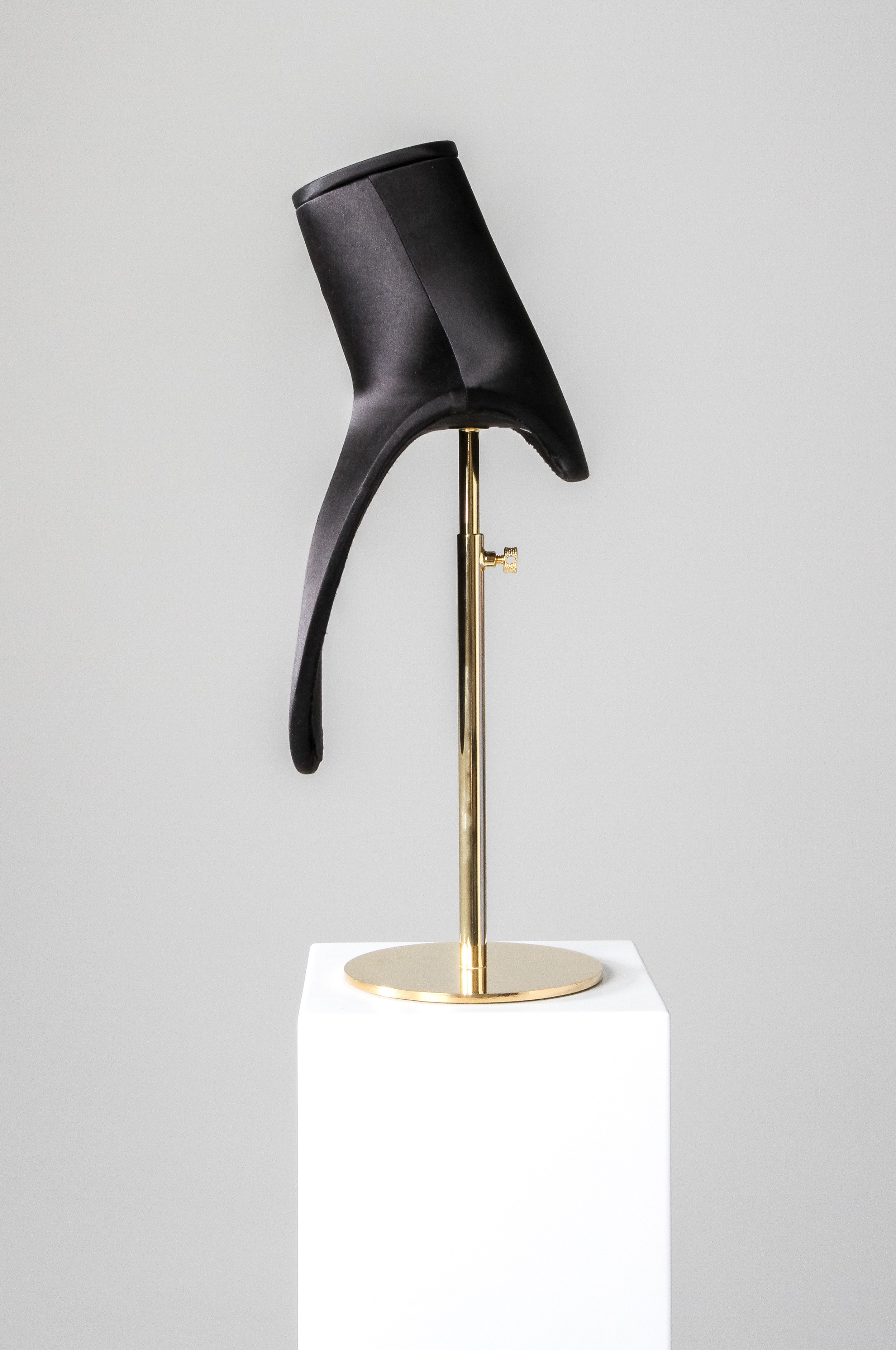 Jewelry bust display with a sleek, minimalist design, featuring a round gold metal base and stem for added elegance. The bust is covered in a smooth black fabric, making it ideal for showcasing necklaces and other jewelry pieces. Its refined, modern shape highlights the displayed items, creating a sophisticated look perfect for high-end retail environments or exhibitions. The contrast between the black bust and the gold base enhances the overall luxurious feel of the display.
