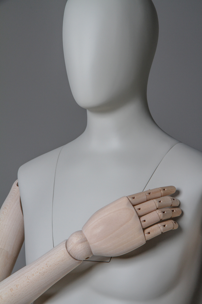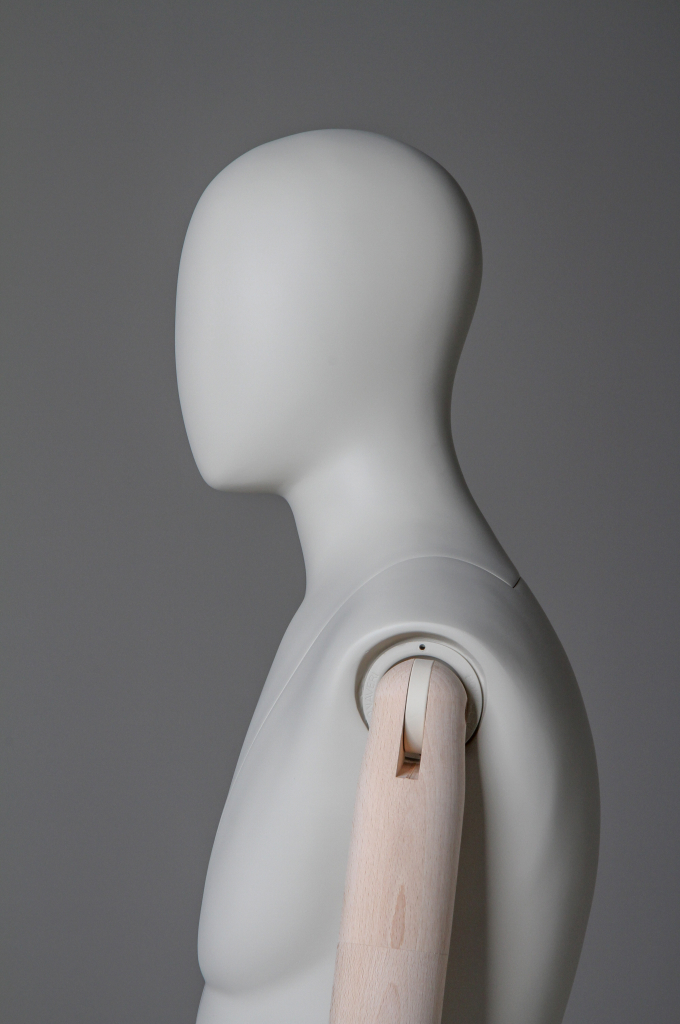 Sartorial male mannequin based on Art. 1121, with painted bust and removable head / bib with fully articulated arms and hands in a raw wood finish, with painted legs.